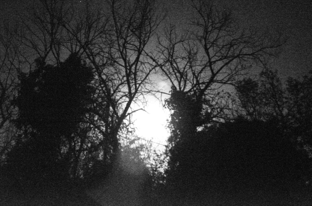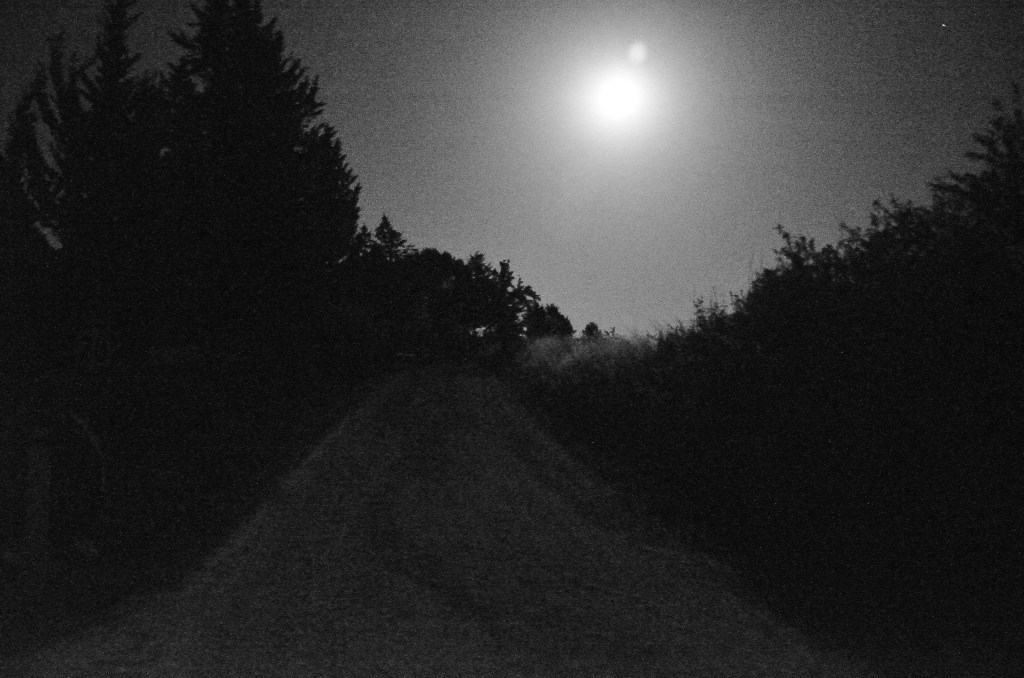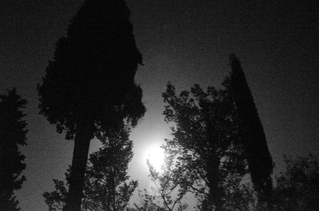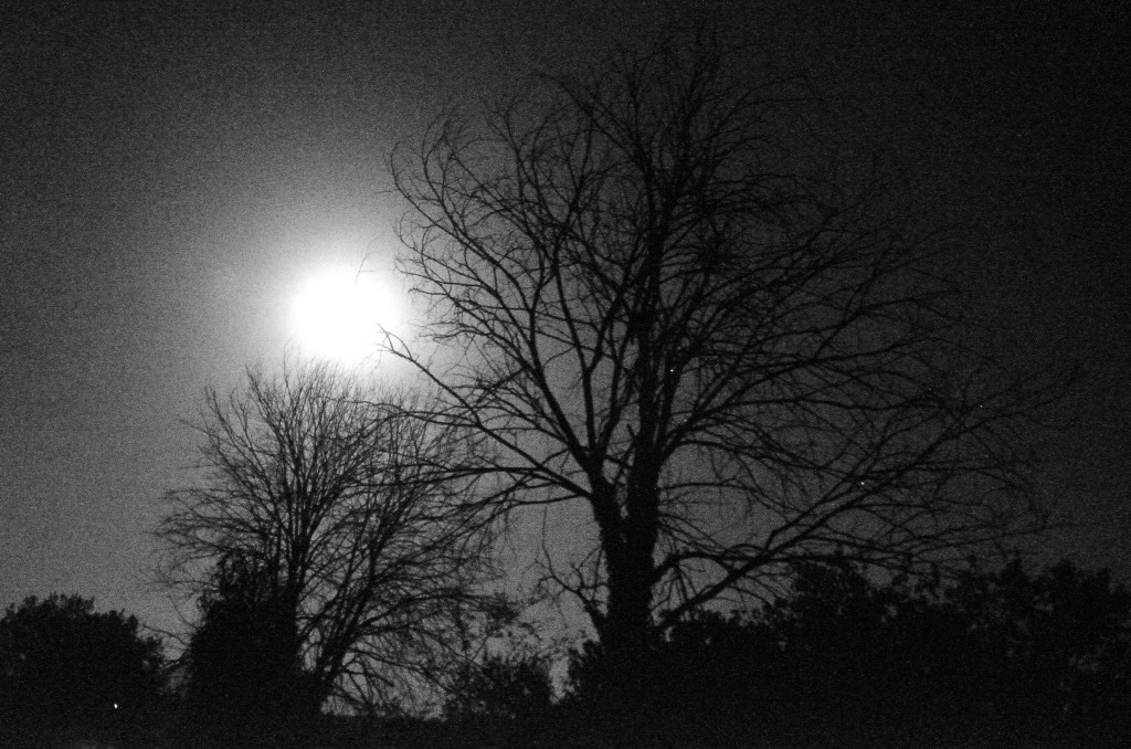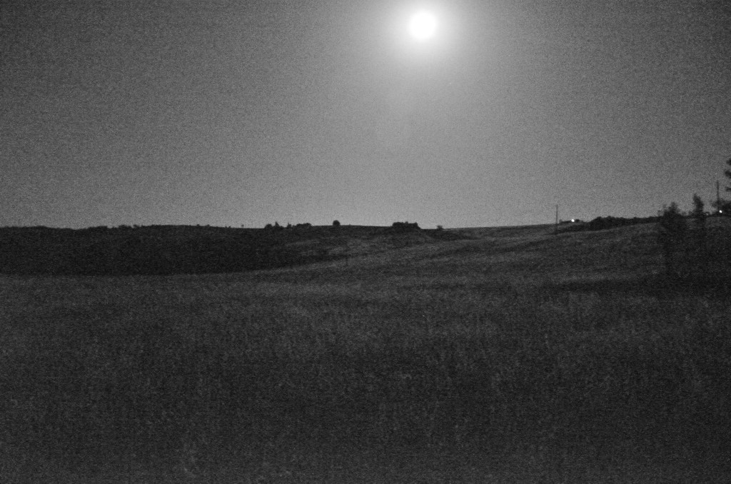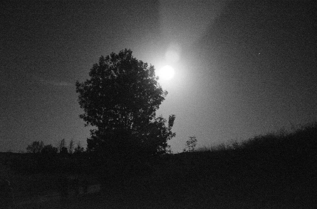 La grana grossolana in qualche modo mi sembra richiami l’aspetto confuso con cui si vedono le cose al buio. Quello che sembra il Sole è in realtà la Luna sovraesposta.